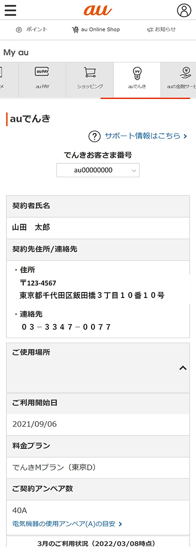 auでんきのご加入状況は「au でんき」タブに表示されます。