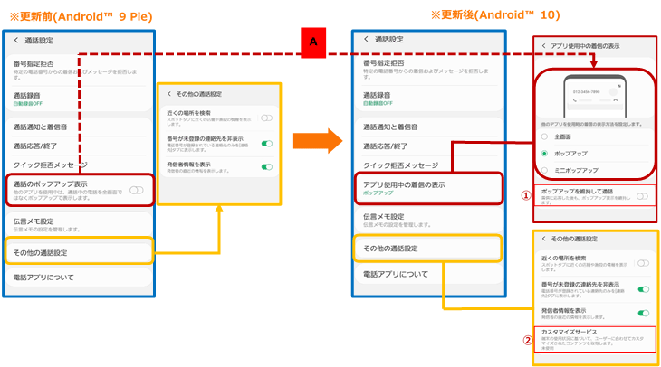 - 「通話設定」画面にて、「通話のポップアップ表示」機能が「アプリ使用中の着信の表示」に機能変更されます。