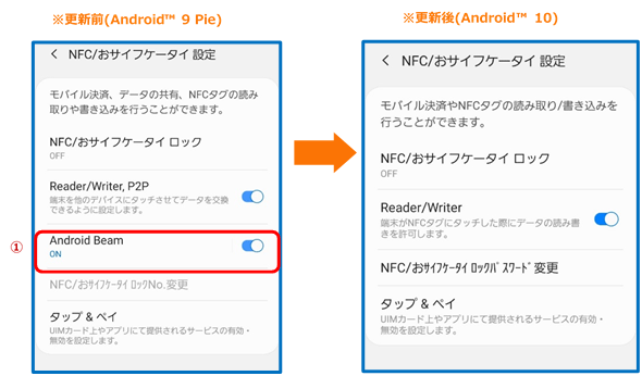 ■[①]「NFC/おサイフケータイ設定」画面にて、「Android Beam」が削除されます。- 「Android Beam On/Off」機能が「Reader/Write On/off」機能に統合されるようになります。