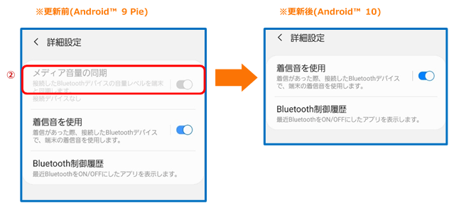 ■[②]「Bluetooth」右上メニュー欄にある「詳細設定」画面にて、「メディア音量の同期」が削除されます。