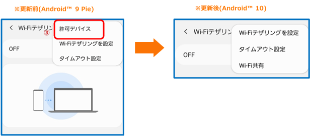 ■[③]「Wi-Fiテザリング」設定画面にて、右上メニュー欄配下の「許可デバイス」が削除されます。