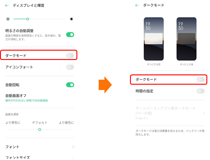 [設定]>[ディスプレイと輝度]>[ダークモード]