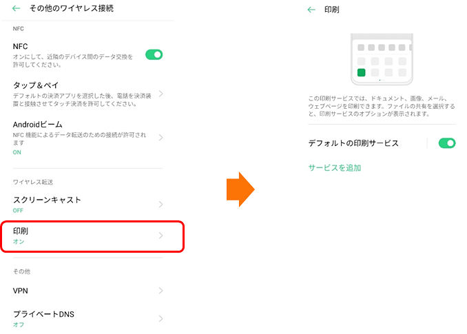[設定]>[その他のワイヤレス接続]>[印刷]