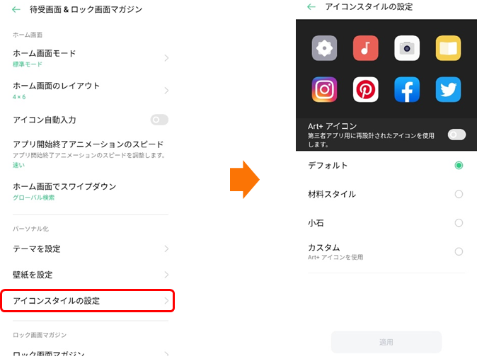 [設定]>[待受画面&ロック画面マガジン]>[アイコンスタイルの設定]