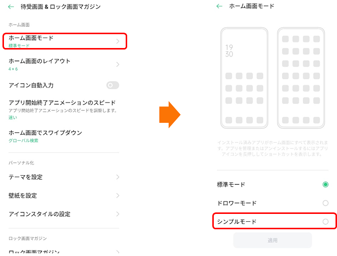 [設定]>[待受画面&ロック画面マガジン]>[ホーム画面モード]>[シンプルモード]