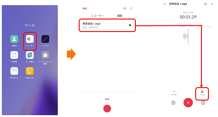 [ツール]フォルダ>[レコーダー]>[対象の録音ファイル]>[トリム]