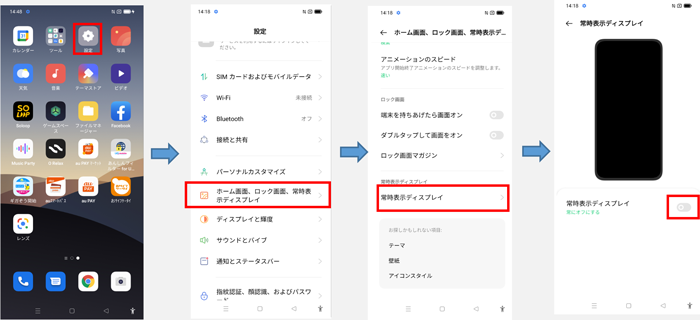 「設定」→「ホーム画面、ロック画面、常時表示ディスプレイ→「常時表示ディスプレイ」