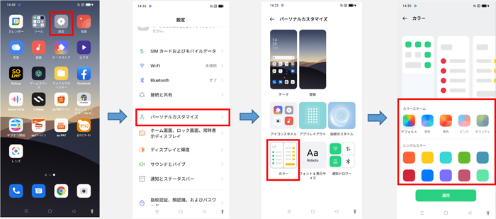 「設定」→「パーソナルカスタマイズ」→「カラー」