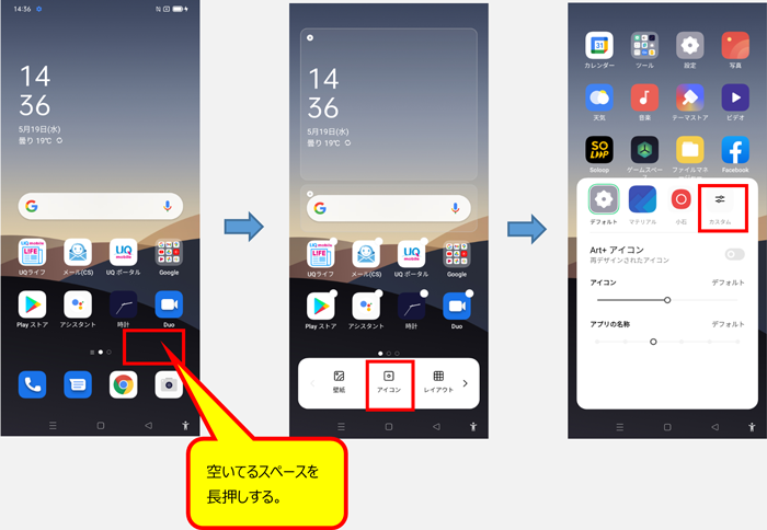 ホーム画面の空いているスペース長押し→「アイコン」→「カスタム」