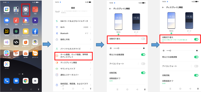 - ダークモードが日の出と日の入りのタイミングに合わせて自動的にON/OFFする機能
