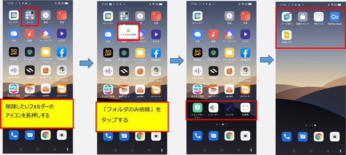 フォルダーの削除:対象フォルダーのアイコンを長押しする→「フォルダーのみ削除」