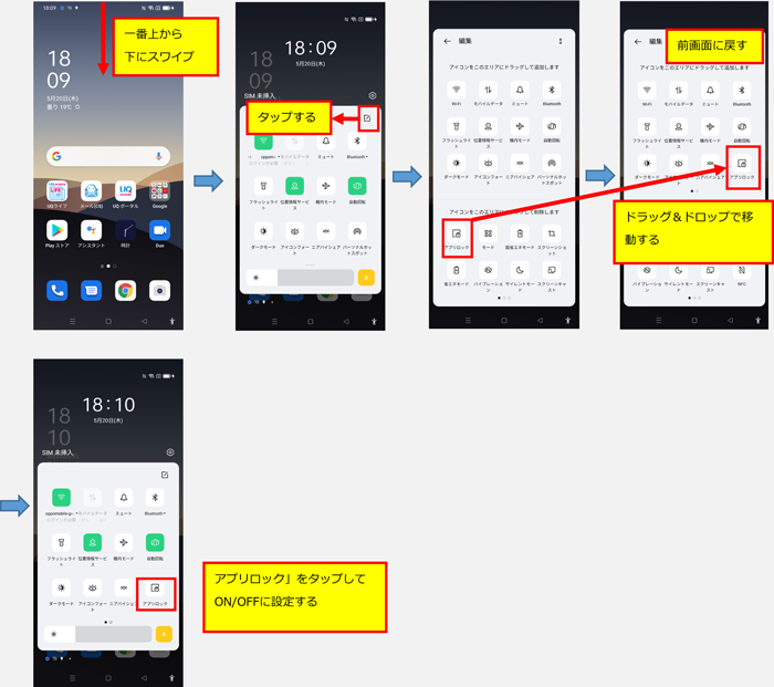 ホーム画面に画面の一番上から下にスワイプ→ マークをタップ→「アプリロック」を追加する