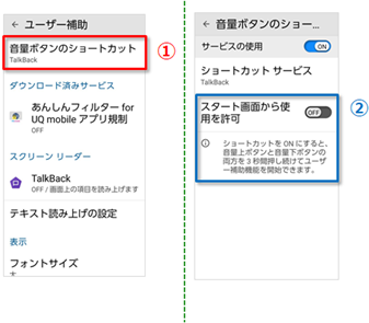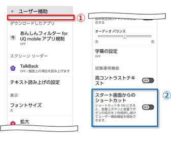 「音量ボタンのショートカット」配下にあった「スタート画面から使用を許可」は、「ユーザー補助」配下に「スタート画面からのショートカット」と表示されます。[②]