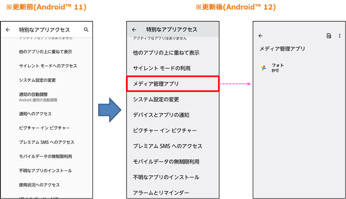 「メディア管理アプリ」設定方法:「設定」→「アプリ」→「特別なアプリアクセス」→「メディア管理アプリ」を選択
