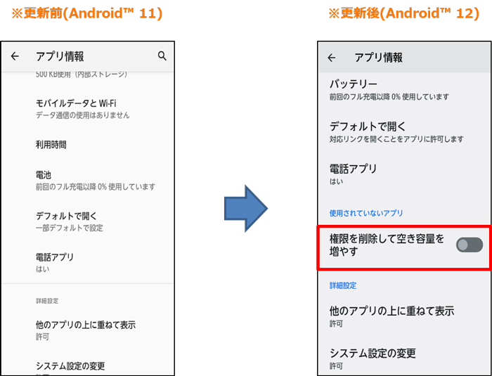 - 個別アプリ情報内に「権限を削除して空き容量を増やす」が追加されます。