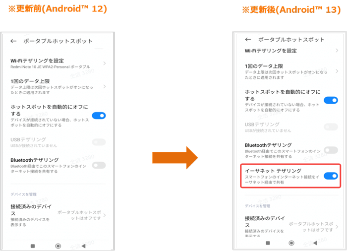 - 「ポータブルホットスポット」に、「イーサネット テザリング」が追加されます。スマートフォンのインターネット接続をイーサネット経由(有線LAN接続)で共有できます。