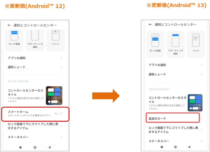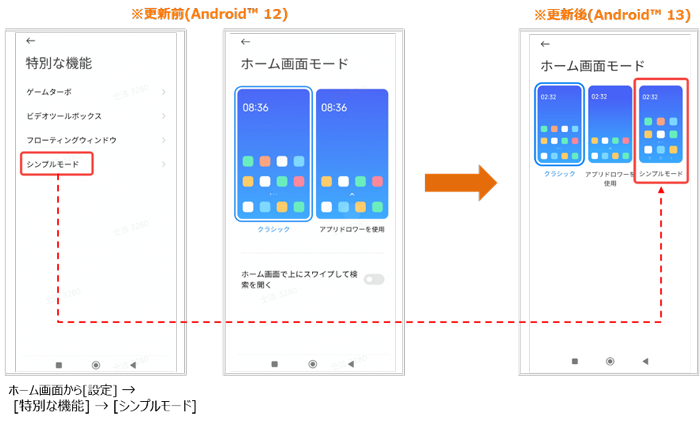 - OSアップデートにより、お客さまのスマートフォンはAndroid™ 13に更新され、画面操作や機能が変更されます。