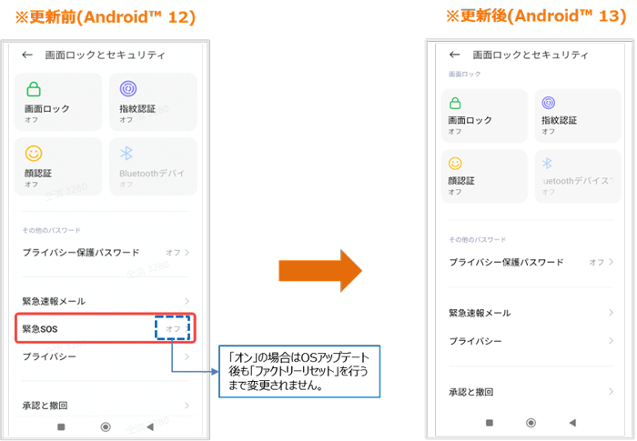 - ※OSアップデート前にXiaomiの緊急SOSをご利用(オン)の場合は、OSアップデート後も継続してご利用いただけます。ただし、全てのデータを消去する「ファクトリーリセット」を行うと、Xiaomiの緊急SOS機能は削除されますのでご注意ください。
