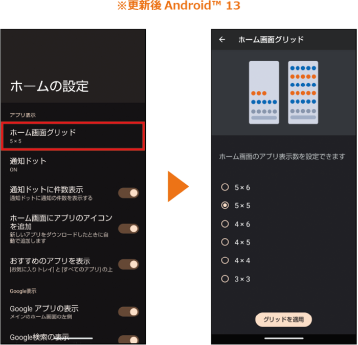 - ホーム画面・アプリ一覧画面に表示するアプリアイコンの数を設定する機能が追加されます。