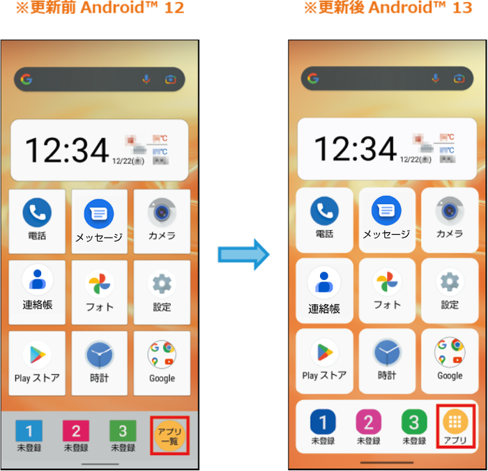 - Android 12で動作しているアプリケーションのAndroid 13上での動作は保証できません。アプリケーションの対応OSなどをご確認の上、OSアップデートを実施してください。