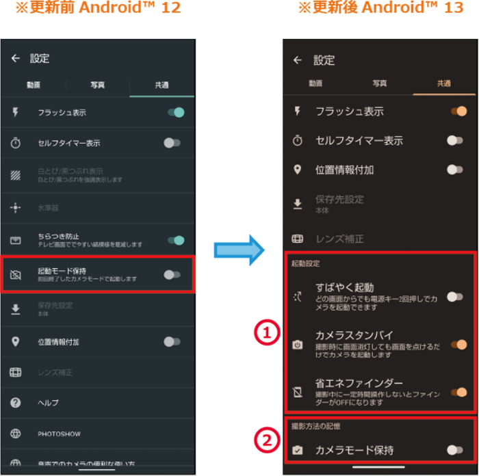 また、「起動モード保持」が「カメラモード保持」に変更されます。「②」