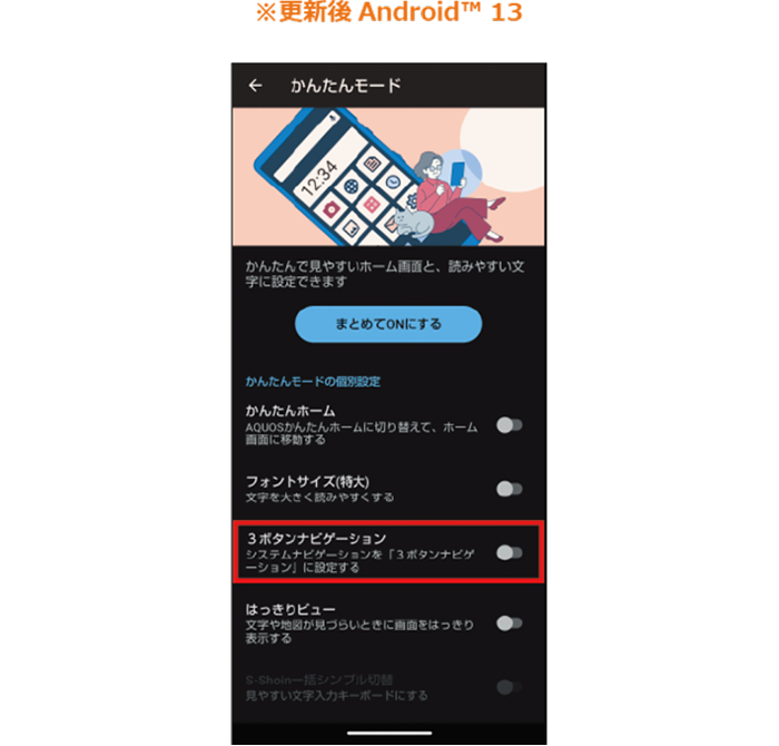 - 本製品の操作方法を3ボタンナビゲーションに変更する項目が追加されます。