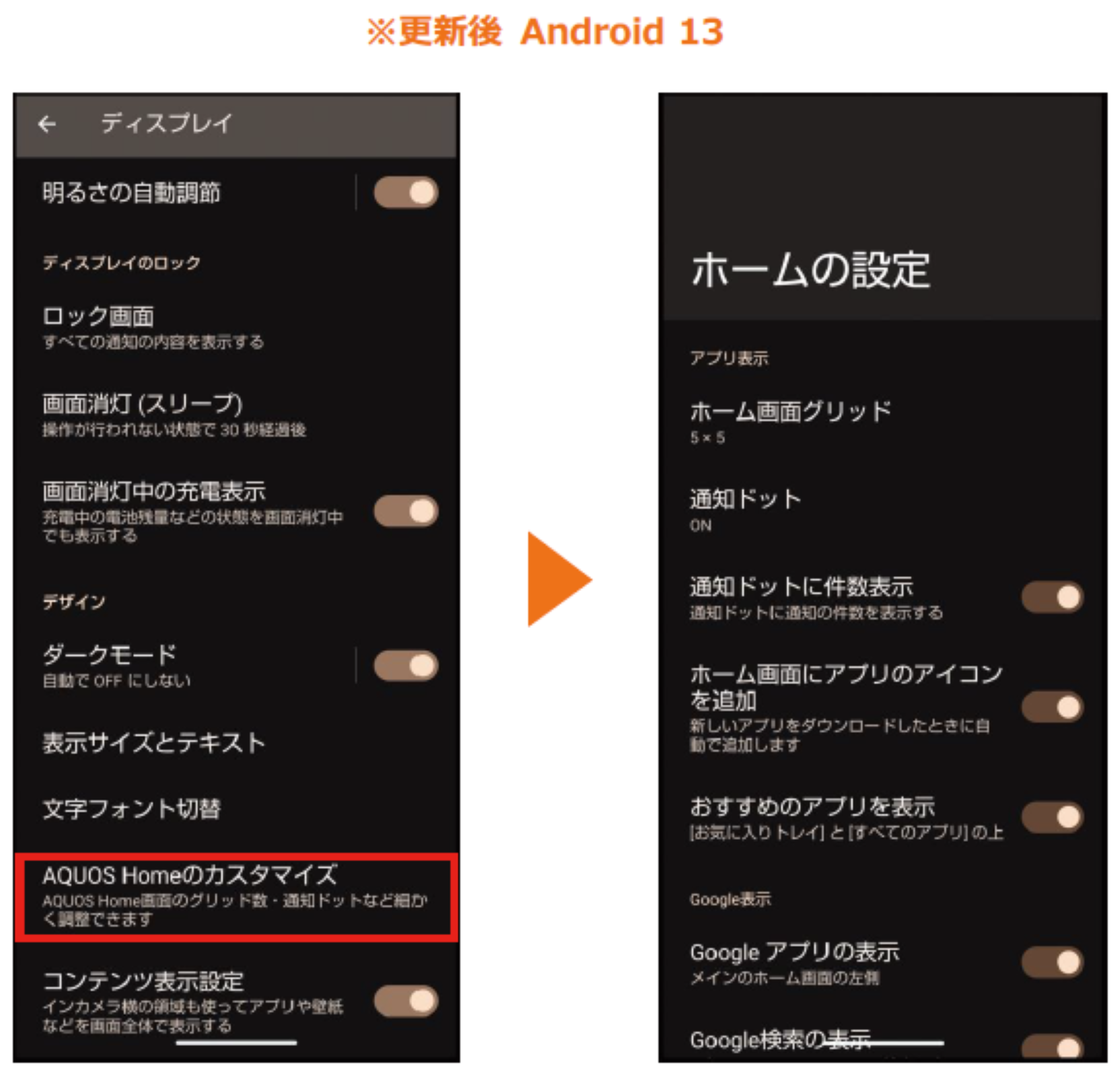- 「ディスプレイ」設定に、AQUOS Homeのホーム設定を表示する項目が追加されます。