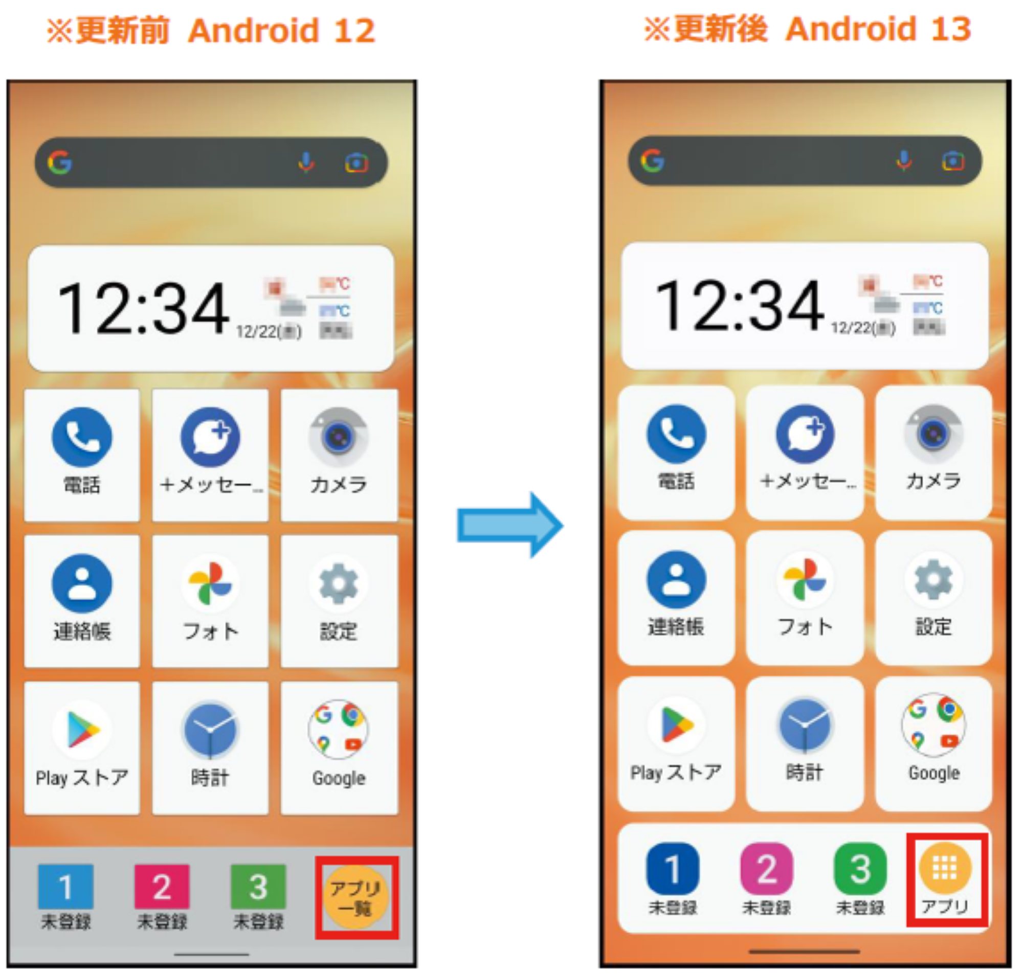 - Android 12で動作しているアプリケーションのAndroid 13上での動作は保証できません。アプリケーションの対応OSなどをご確認の上、OSアップデートを実施してください。