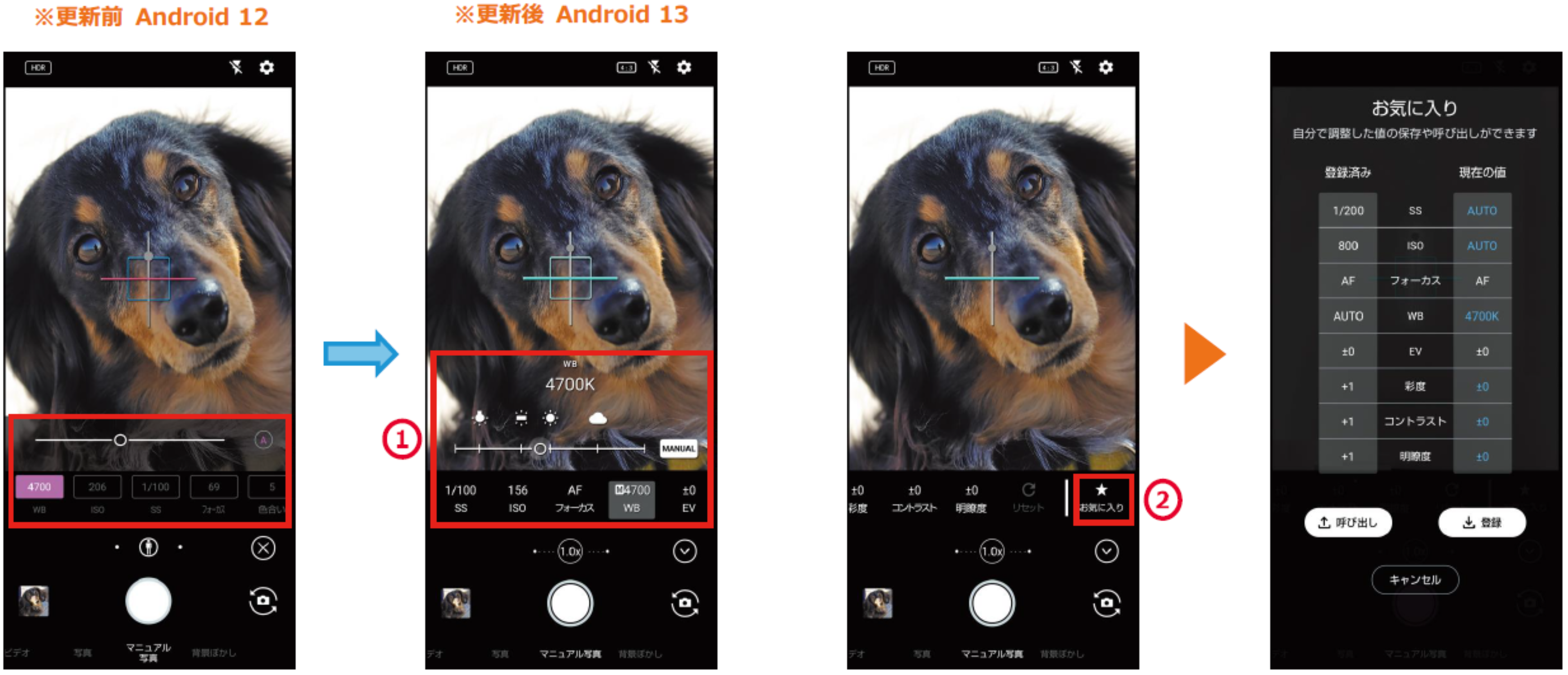 - マニュアル撮影画面の操作方法が変更になります。「①」