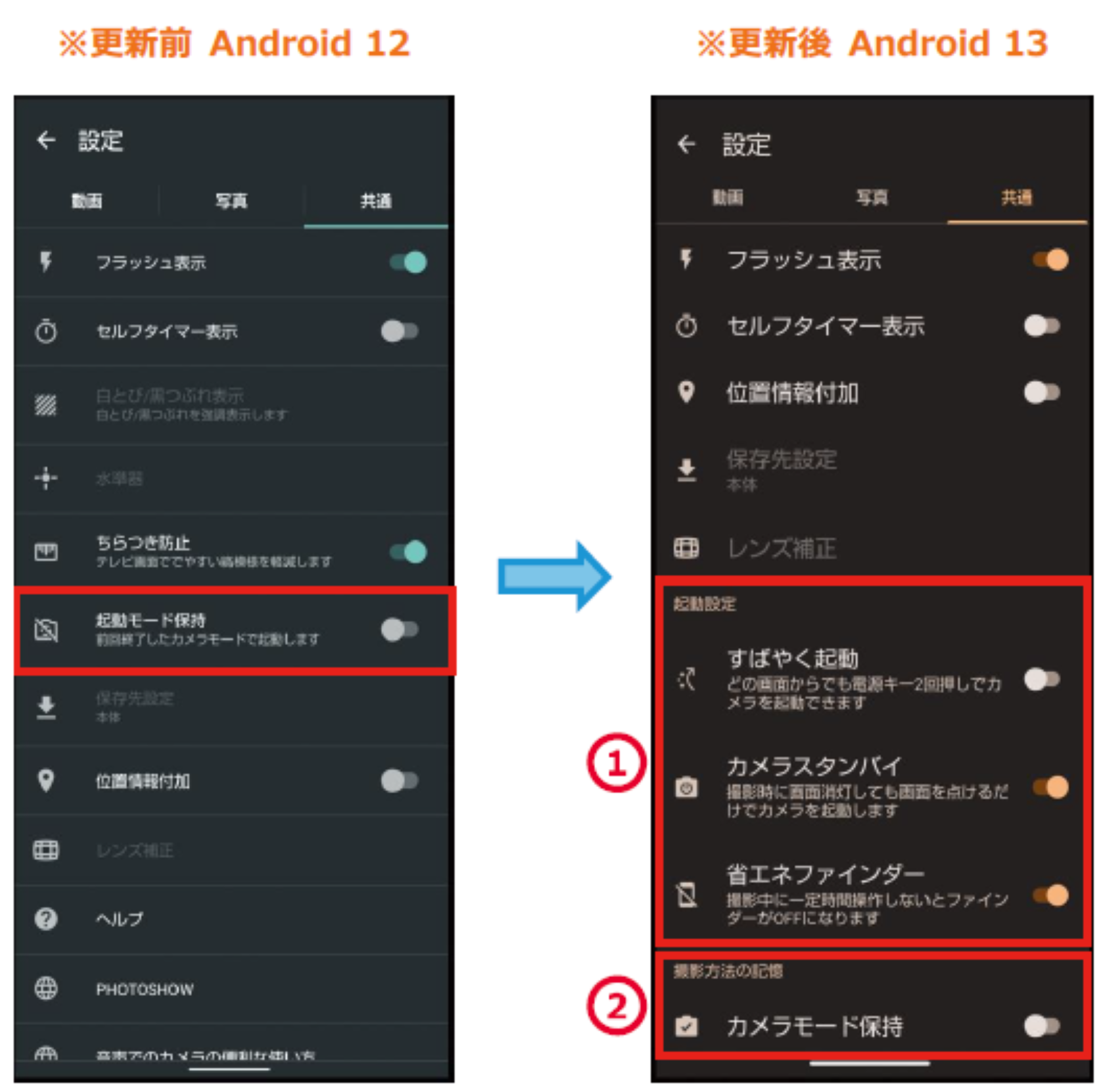 また、「起動モード保持」が「カメラモード保持」に変更されます。「②」