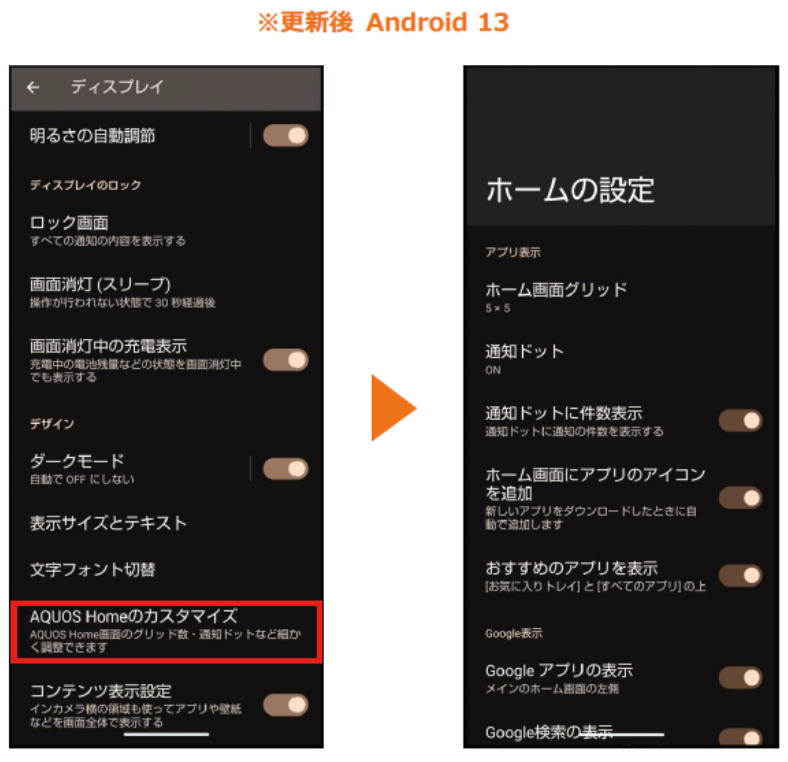 - OSアップデートにより、お客さまのスマートフォンはAndroid 13に変更され、画面操作や機能が変更されます。