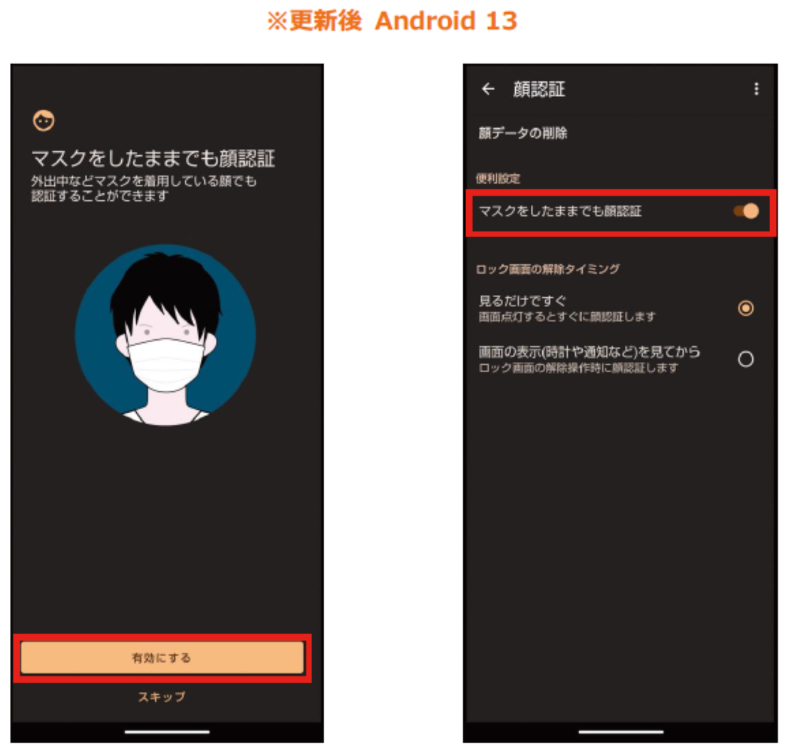 Android 13への更新前に顔を登録されている場合は、再度登録を行っていただく必要があります。