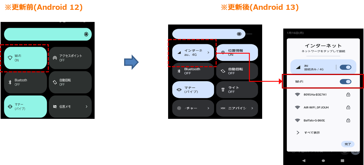 - Android 12で動作しているアプリケーションのAndroid 13上での動作は保証できません。アプリケーションの対応OSなどをご確認の上、OSアップデートを実施してください。