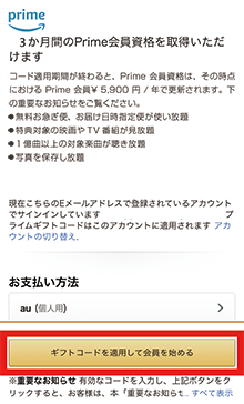 他社のキャンペーンなどで取得した「Amazonプライムギフトコード」を適用中のお客さまは、UQ mobileのギフトコードを適用できないことがあります。現在の会員資格の更新日以降に改めてお手続きをお願いします。更新日は、Amazonの会員情報ページからご確認いただけます。