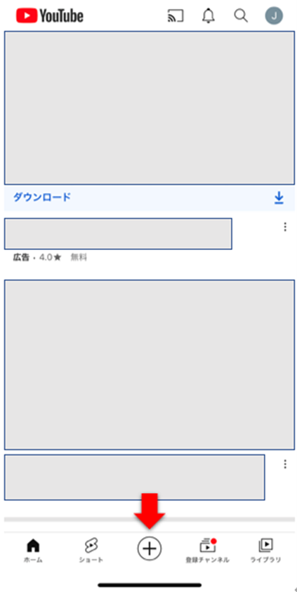 1.YouTubeアプリを起動してログインしたら、画面下部に表示されている「作成アイコン」をタップします。
