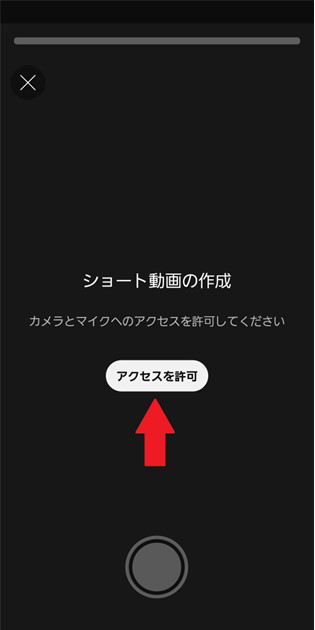 1.「ショート動画を作成」を始めてタップすると、カメラとマイクへのアクセス許可を求められるので、「アクセスを許可」をタップします。