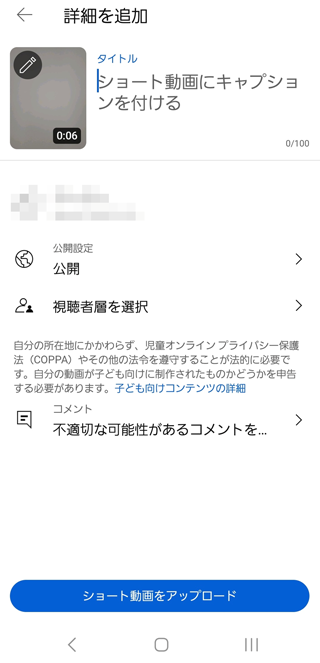 ショート動画をアップロードする際は、下記の項目を決める必要があります。