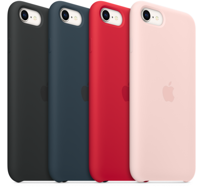iPhone SEのシリコーンケースは、ミッドナイト、アビスブルー、(PRODUCT)RED、チョークピンクから選べます◊。