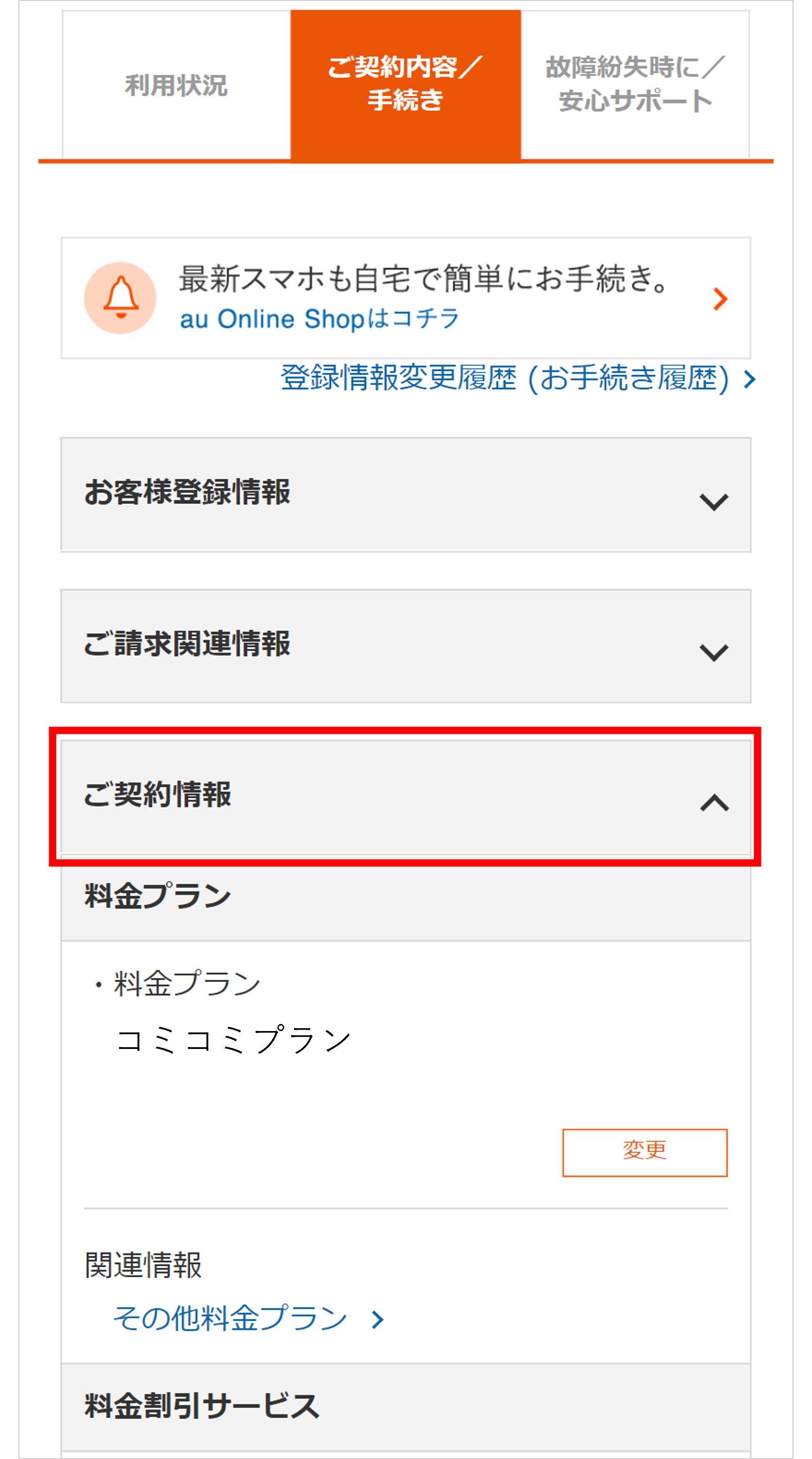 「ご契約情報」をタップしてプルダウンを開く。