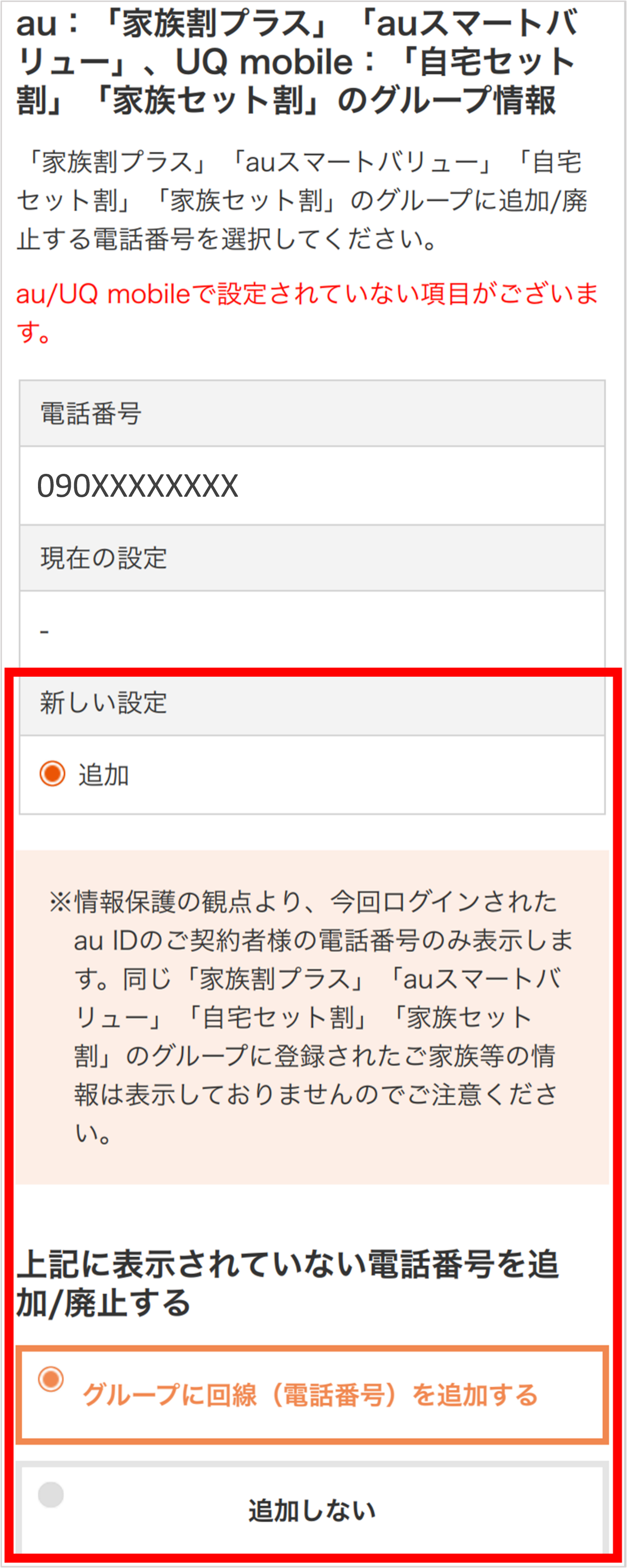 - ※過去に、auの「家族割プラス」「auスマートバリュー」、UQ mobileの「自宅セット割」「家族セット割」のいずれかにご加入の場合、グループが設定されている(「現在の設定」に”登録済み”と記載)場合があります。