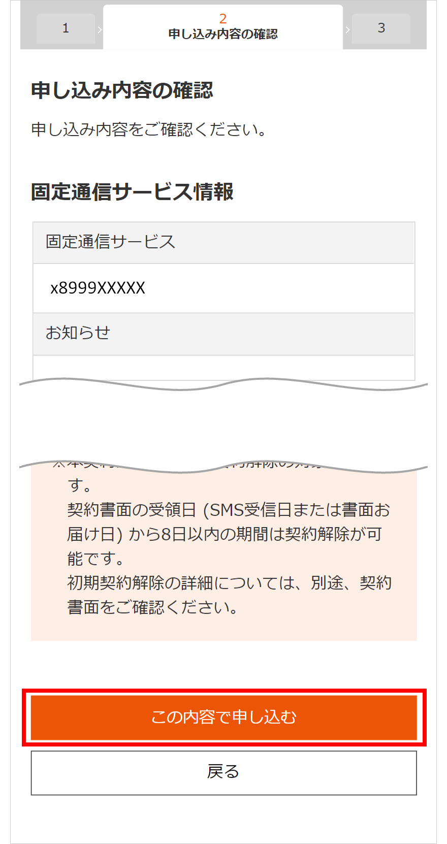 お申し込み内容を確認し、「この内容で申し込む」をタップする。