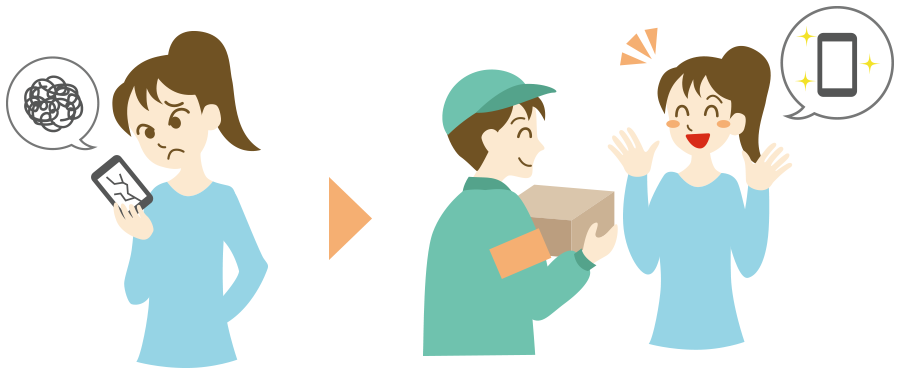 ご利用中の携帯電話機が故障・破損した場合、当社が指定する同等機種の交換用携帯電話機(リフレッシュ品)をお届けするサービスです。最短で当日中、原則お申し込み完了の翌日にお届けします。