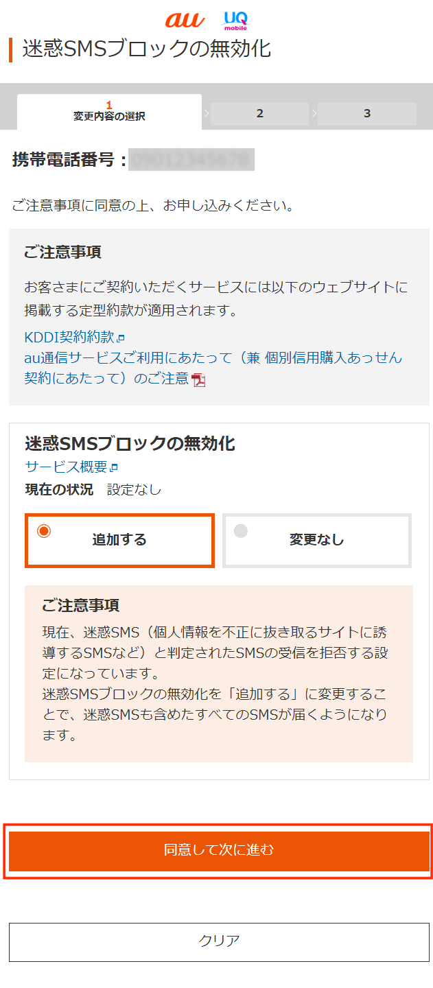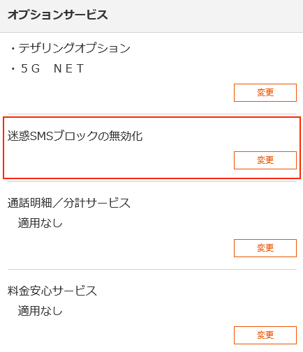 本機能は解除をすることも可能です。解除(オプションを追加)すると、迷惑なSMSを含めたSMSを受信します。
