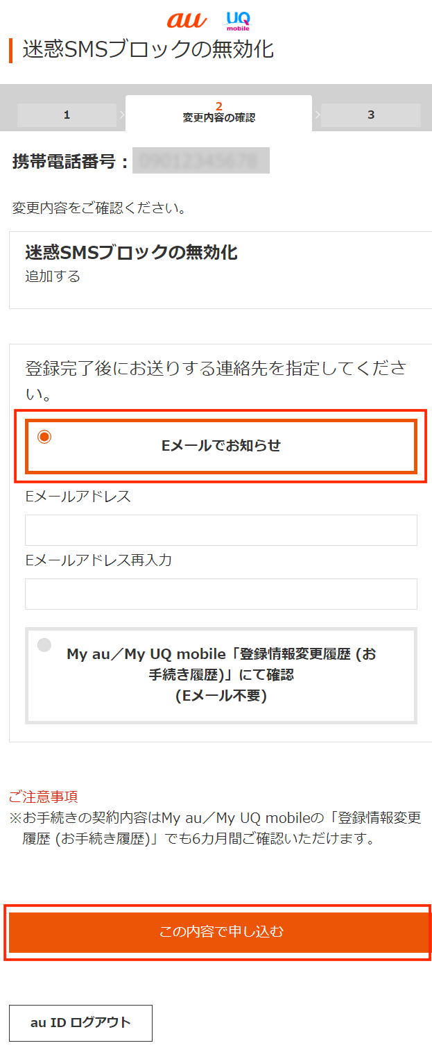 「Eメールでお知らせ」を選択された場合は、「au-hpcustomerservice@au-cs-mail.kddi.com」