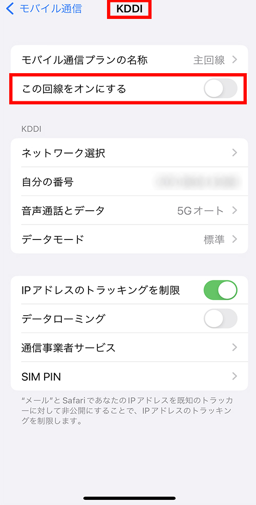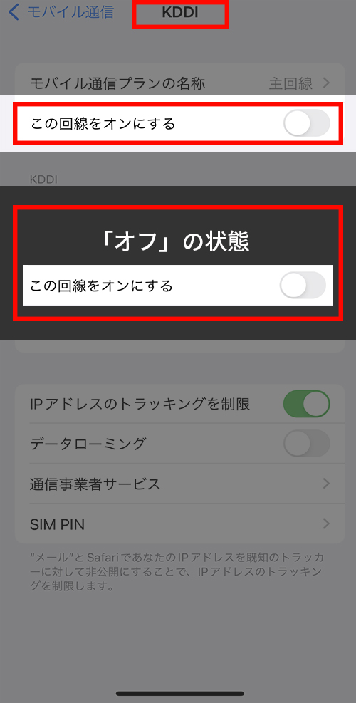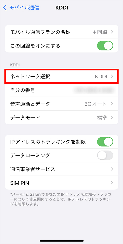②主回線をタップ > ネットワーク選択の表示が「KDDI」