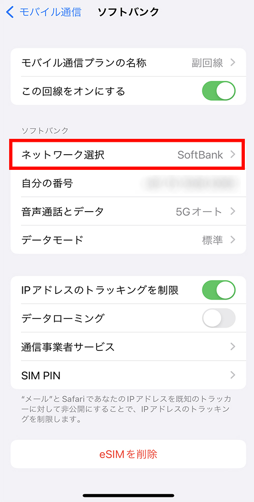 ②副回線をタップ > ネットワーク選択の表示が「Softbank」
