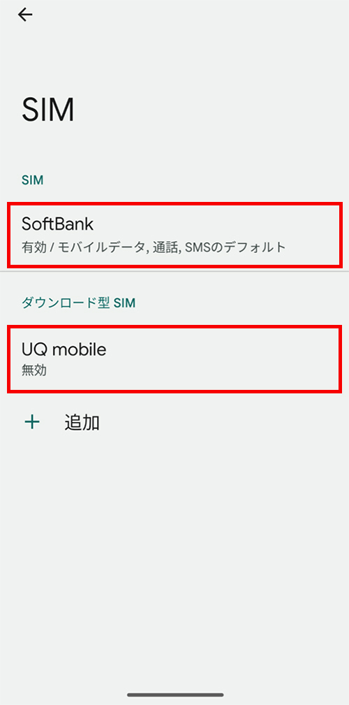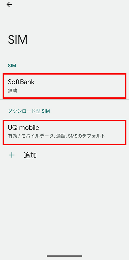 ①UQ mobileが「有効/モバイルデータ、通話、SMSのデフォルト」
