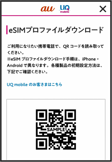 UQ mobile オンラインショップから送信されたメールを持参のうえ、お近くのau Style/auショップ・UQスポットへご来店いただきeSIMプロファイルダウンロードのお手続きを行ってください。