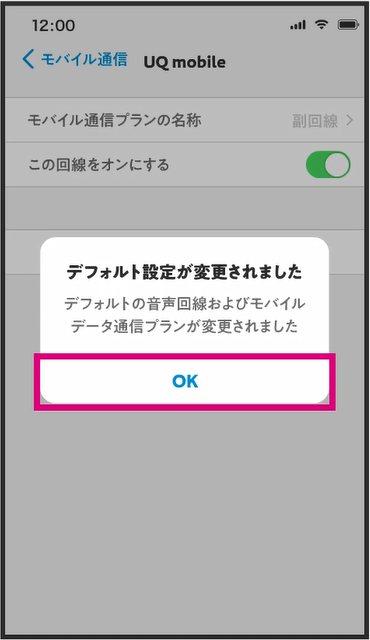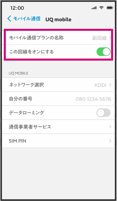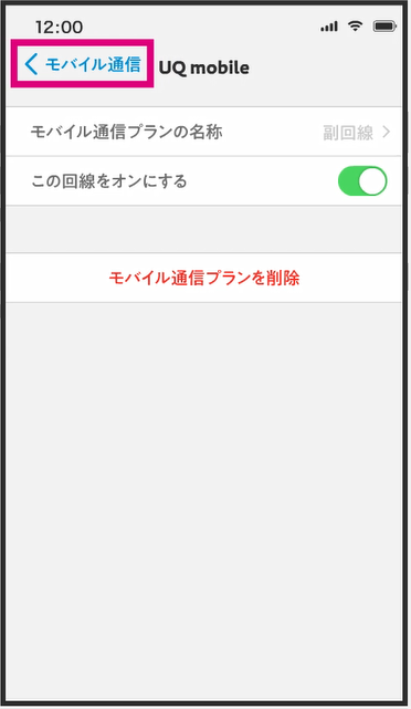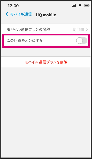 【3】モバイル通信が「UQ mobile」になっていることを確認し、「この回線をオンにする」をスワイプ