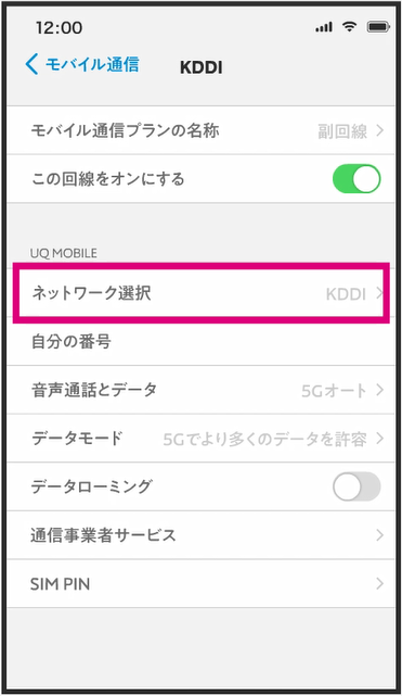 【7】ネットワーク選択が「KDDI」になっていることを確認し、設定完了